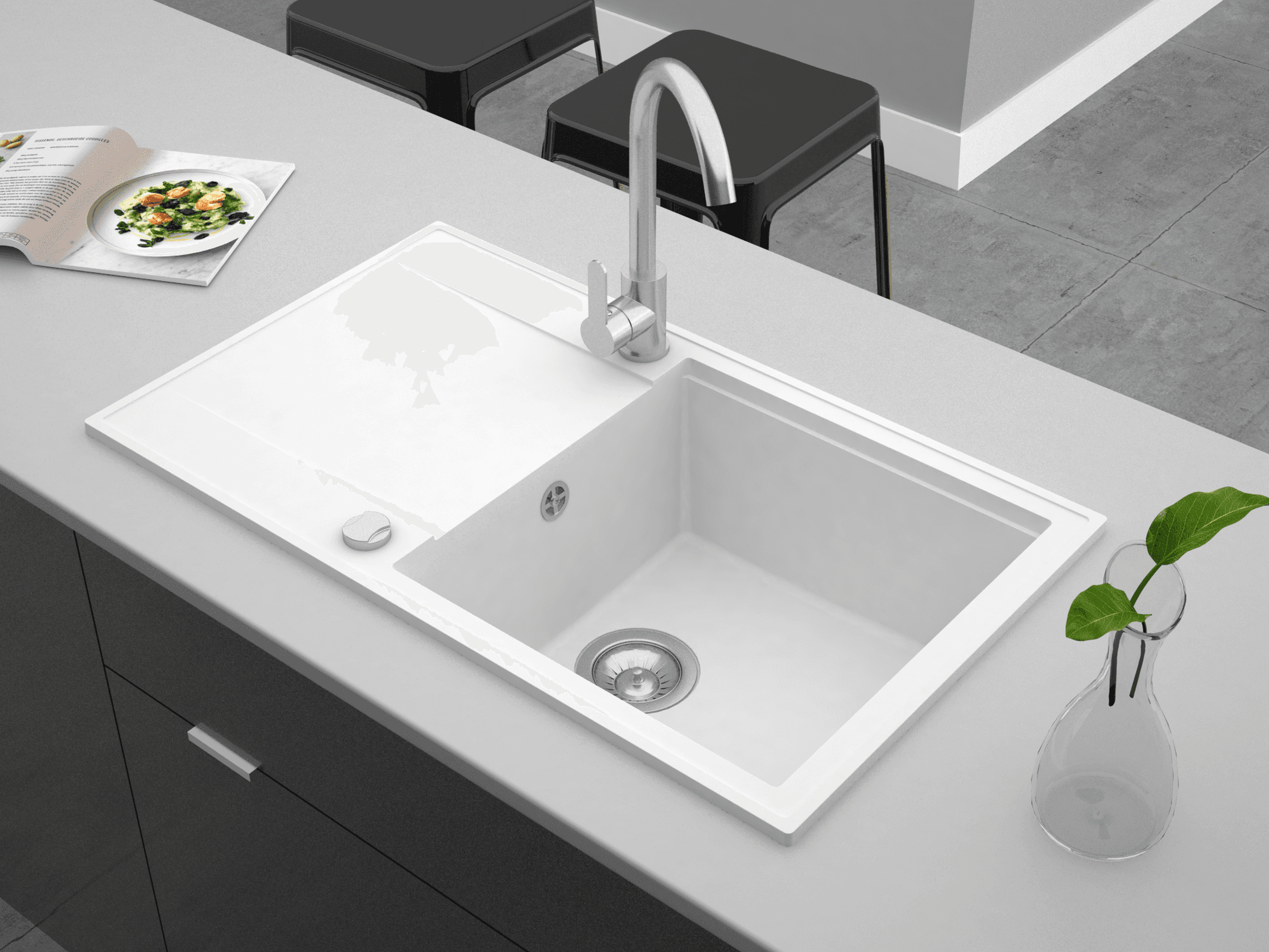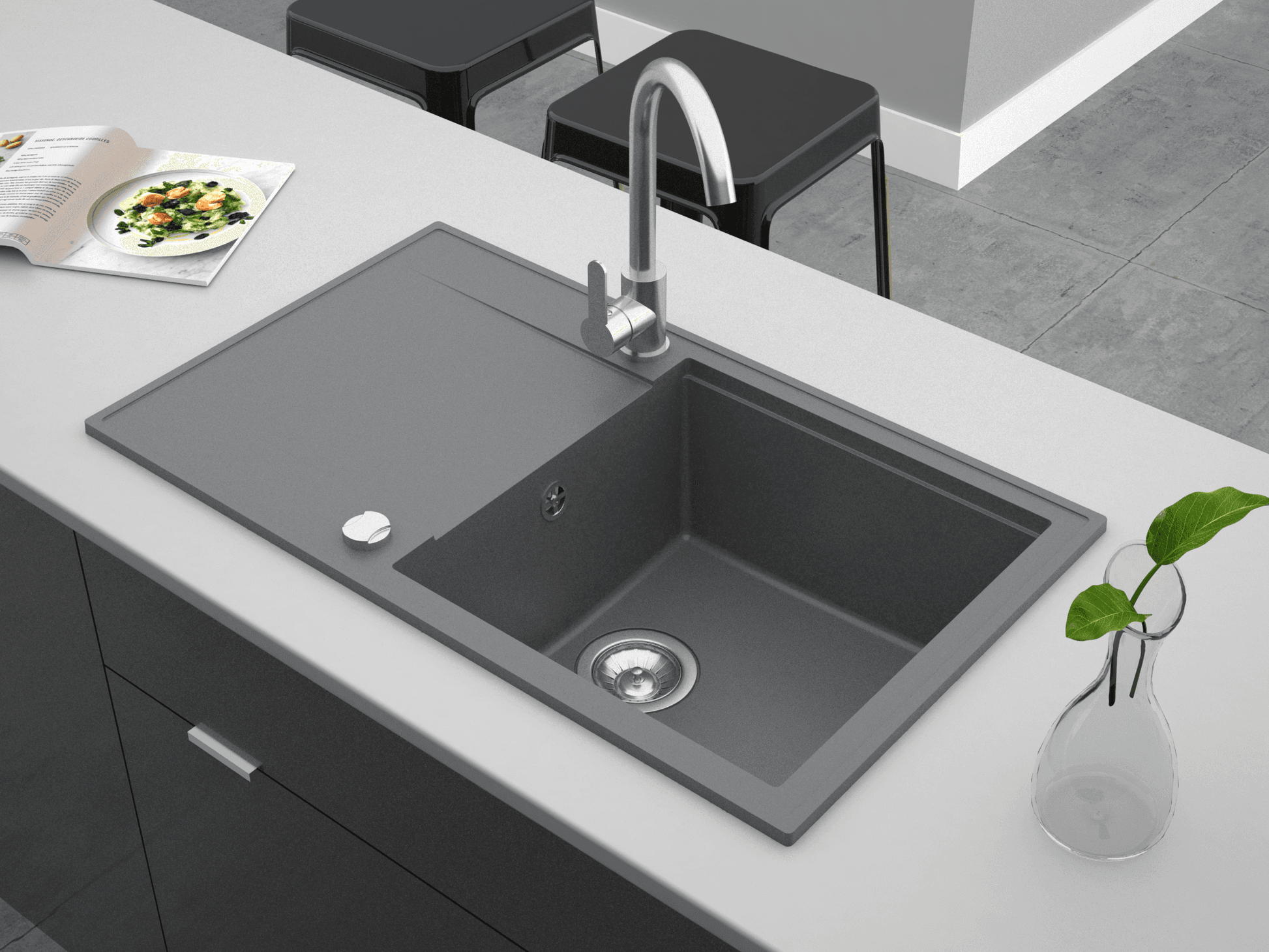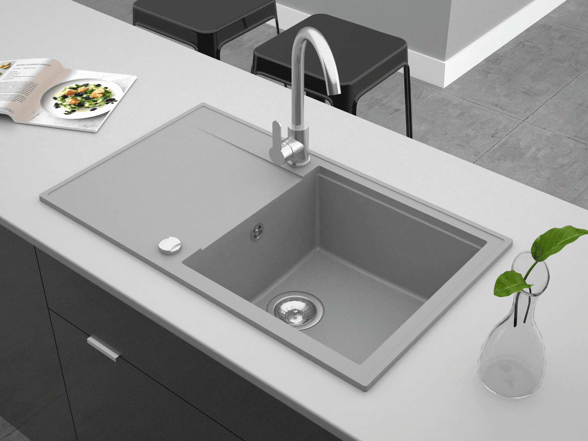 Unsere Spülen der CASCADA-Linie bestehen aus hochwertigem Granitverbund, das für seine Kratzfestigkeit, Pflegeleichtigkeit und Hitze- und UV-Beständigkeitbekannt ist. Dieses Material sorgt für eine lange Lebensdauer und eine edle Optik in Ihrer Küche.